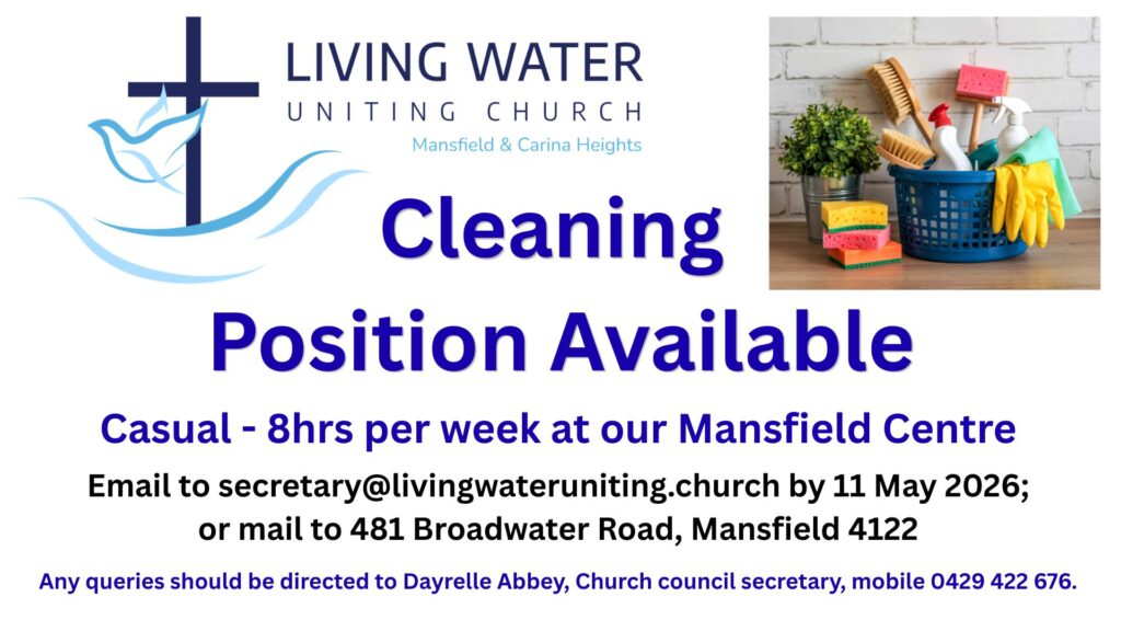 Living Water Uniting Church are calling for applicants for a casual, 8 hour per week, cleaning position at our Mansfield Centre. The focus of this role is to ensure that…