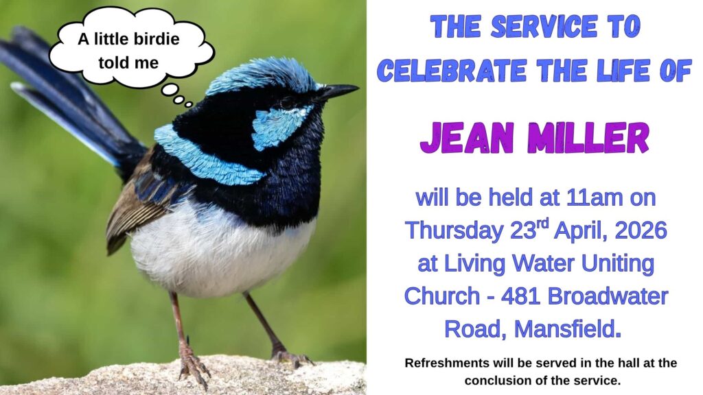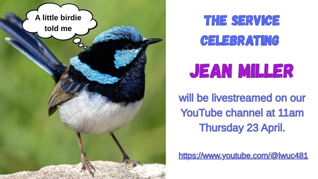 Jean’s service will be live streamed on our YouTube channel. Just go to Living Water Uniting Church on YouTube at 11am on 23 April or follow this link: https://www.youtube.com/@lwuc481